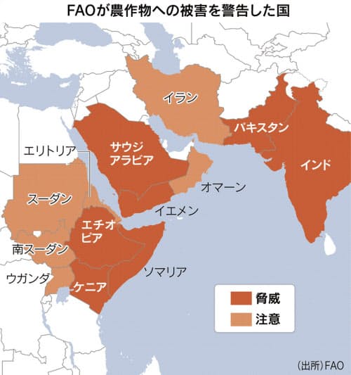 FAOは殺虫剤の散布や食糧支援などの緊急対策のため、必要な資金1億3800万ドル(約150億円)の拠出を各国に呼びかけている。特にアフリカ東部では近年、大雨や干ばつにも見舞われ、不作が続いていた。今春以降の収穫時期までにバッタによる被害を抑えられなかった場合、多くの餓死者が出る可能性もある。(加藤彰介、ニューデリー=馬場燃)
